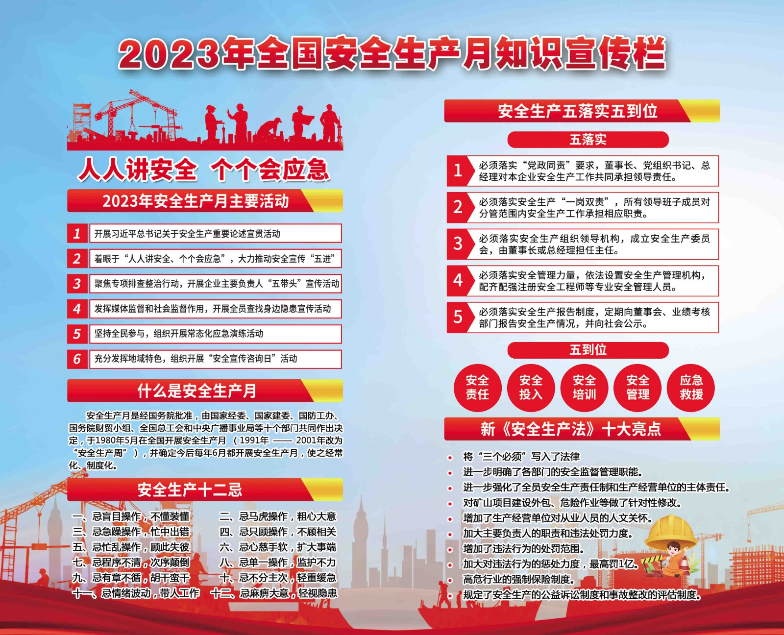 2023年6月是我国第22个安全生产月,集团紧紧围绕“人人讲安全、个个会应急”的活动主题,根据相关文件精神,开展“安全生产月”活动的统一部署和安排,安全设备部及时制定了活动方案,组织召开专题会议进行宣传部署和贯彻落实,使活动开展的有计划、有布置、有检查、有落实,从而使安全生产月活动在集团机关、各分(子)公司、项目部范围内迅速有序开展,通过本次活动的开展,取得了显著的效果: